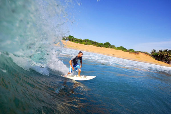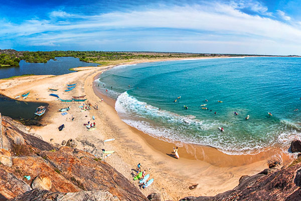 Arugam Bay is a bay situated on the Indian Ocean in the dry zone of Sri Lanka’s southeast coast. The bay is located 320 kilometers (200 mi) due east of Colombo, and approximately 4 kilometers (2.5 mi) south of the market town of Pottuvil. The main settlement in the area, known locally as Ullae, is predominantly Muslim,[1] however there is a significant Tamil and Sinhala population to the south of the village, as well as a number of international migrants, largely from Europe and Australia. While traditionally fishing has dominated the local economy, tourism has grown rapidly in the area in recent years. Tourism in Arugam Bay is dominated by surf tourism, thanks to several quality breaks in the area, however tourists are also attracted by the local beaches, lagoons, historic temples and the nearby Kumana National Park.
